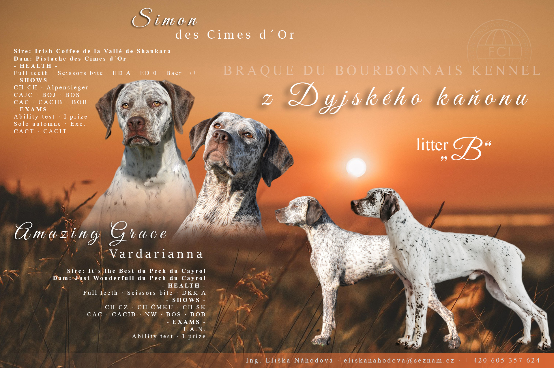 V současné době bereme záznamy na štěňátka bourbonského ohaře z vrhu "B". Jedná se o zahraniční spojení naší fenky Amazing Grace Vardarianna s krásným a velmi pracovně úspěšným švýcarským psem Simonem des Cimes d´´ Or.